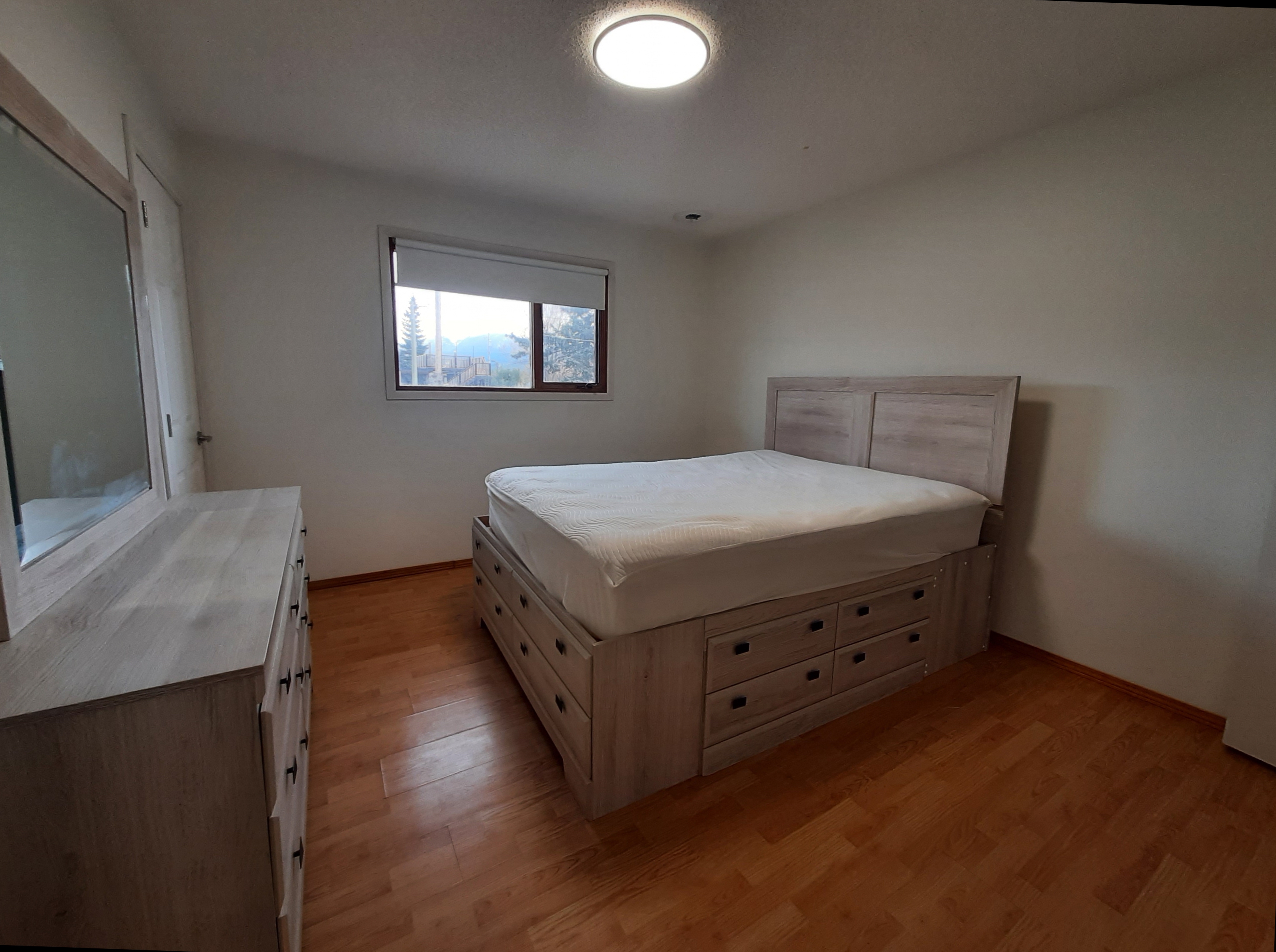 - Furnished with a storage queen bed set, one double bed, couch/coffee table, dining set, and all window coverings. One bedroom is unfurnished.