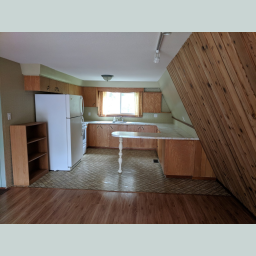 - Kitchen has great storage and prep space and leads to dining/living room with cathedral ceiling.